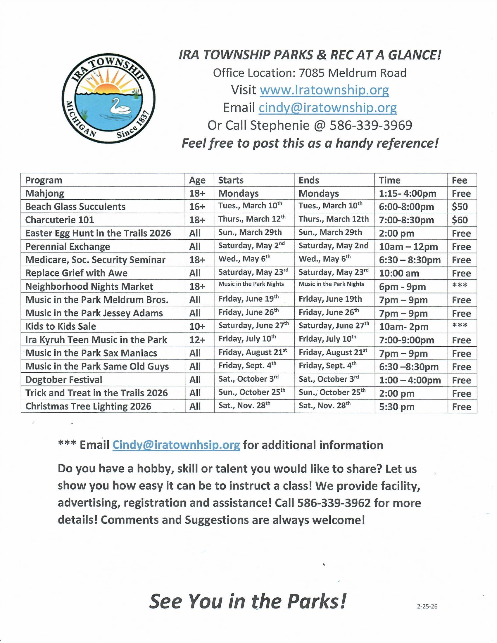 Ira Township provides up to date information, programs, and events on this website and on our official Parks & Recreation Facebook page https://www.facebook.