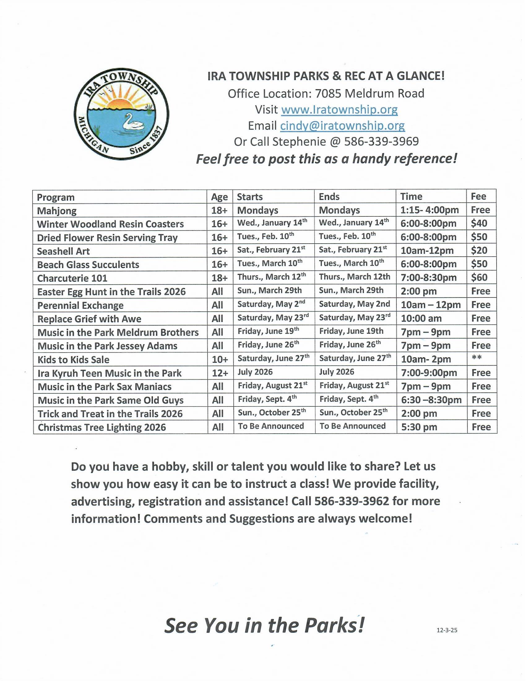 Ira Township provides up to date information, programs, and events on this website and on our official Parks & Recreation Facebook page https://www.facebook.