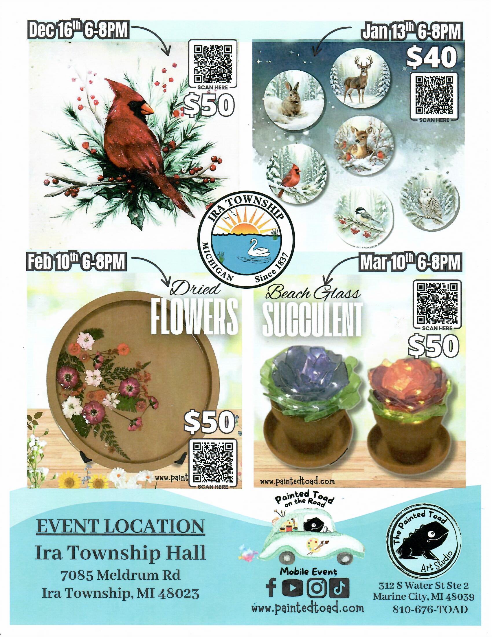 Winter Resin Coasters! Wednesday, January 14th, 6:00 - 8:00 pm At Ira Township Hall. Register directly with Painted Toad Art Studio, www.paintedtoad.com Cost $40
